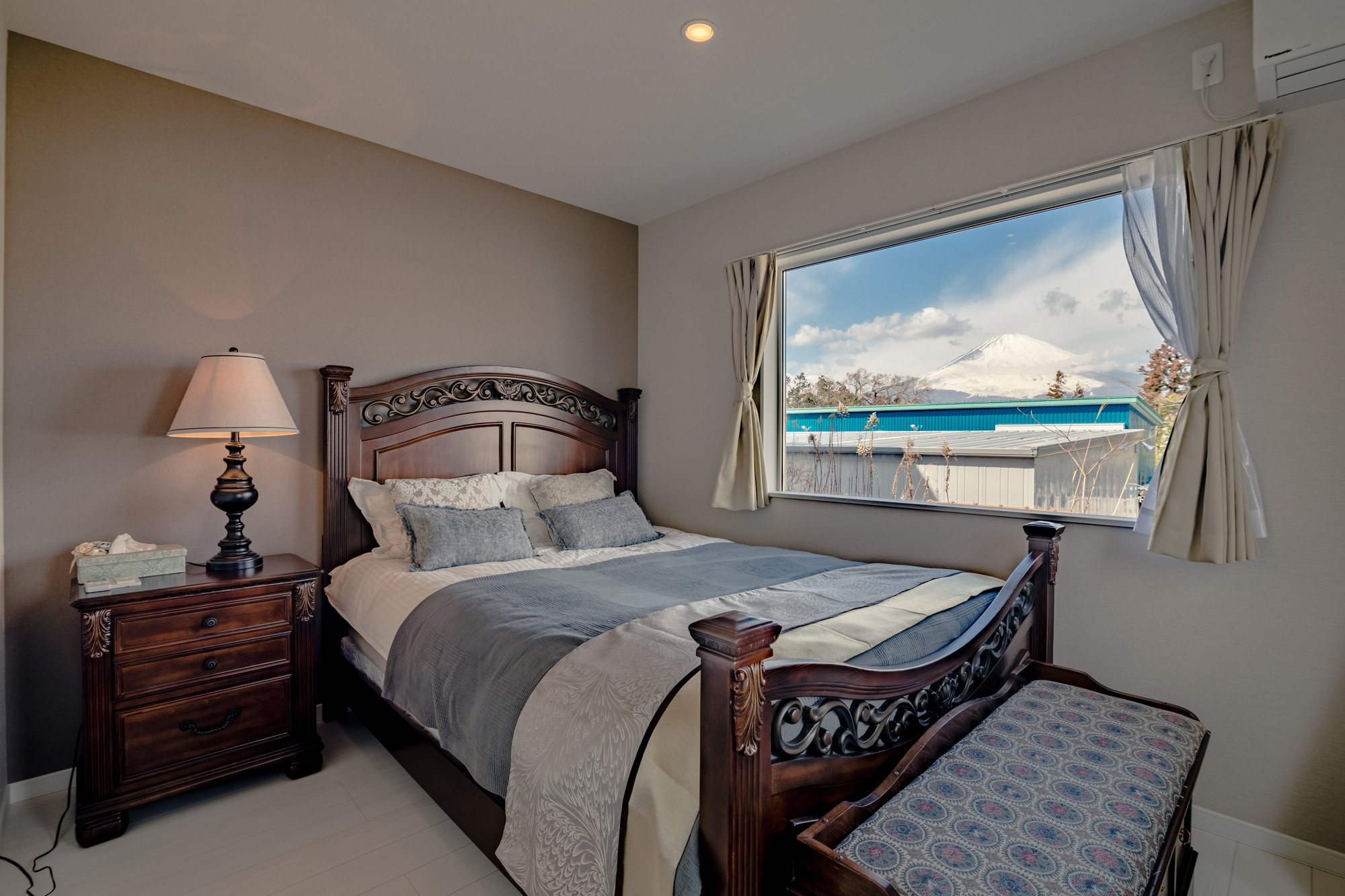 大人気家具ブランドアシュレイのクイーンサイズベットと棚がきらりと光る寝室からは富士山が眺望いただけます。