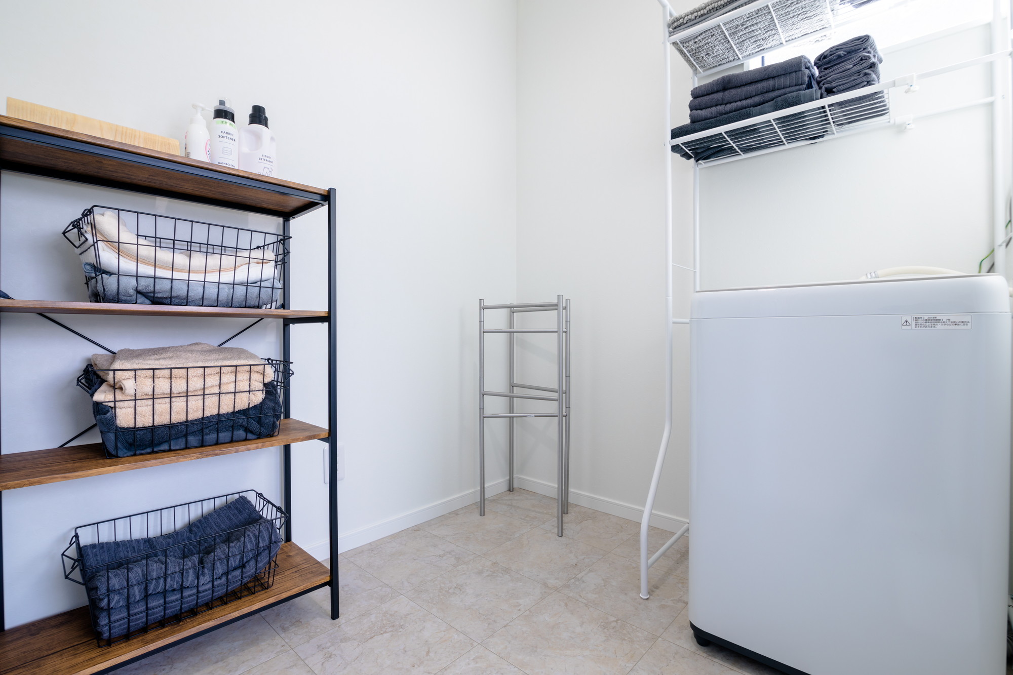 洗濯機も完備しております。洗剤もございますので、長期滞在にも快適にお過ごしいただけます。浴室乾燥機ございますので、乾燥にもご利用ください。