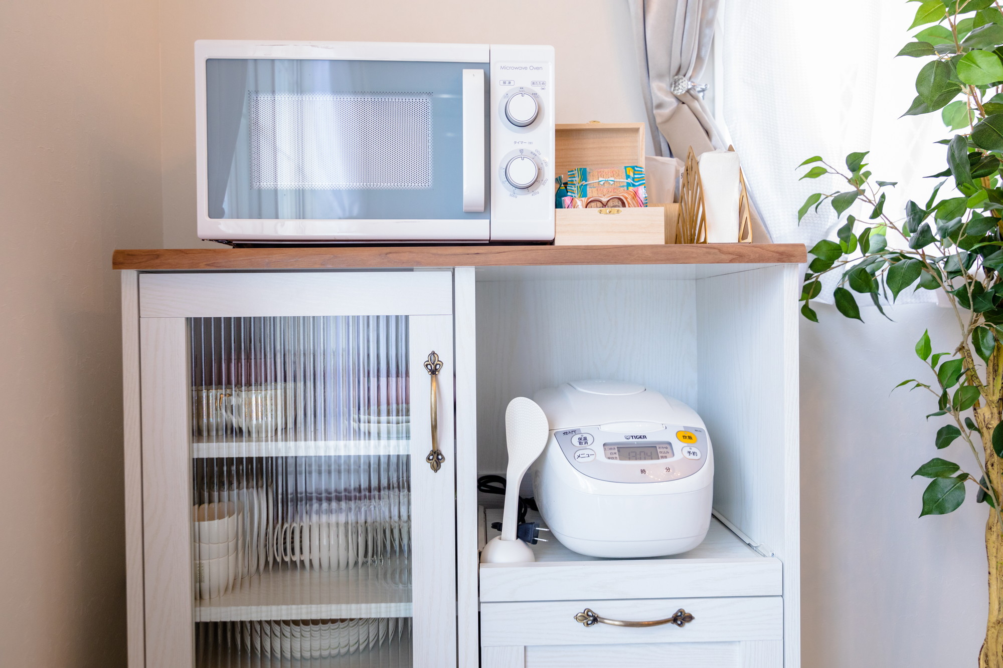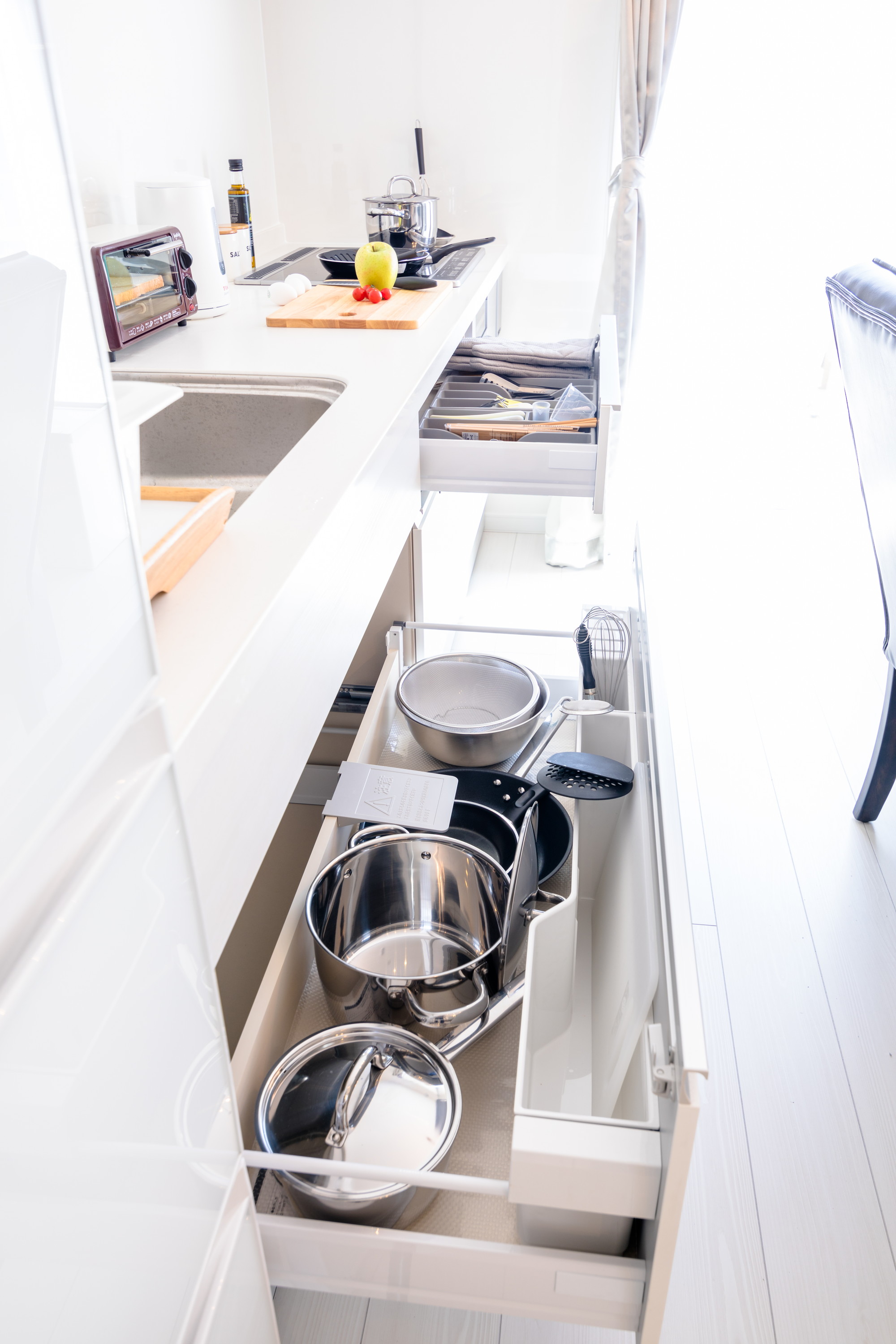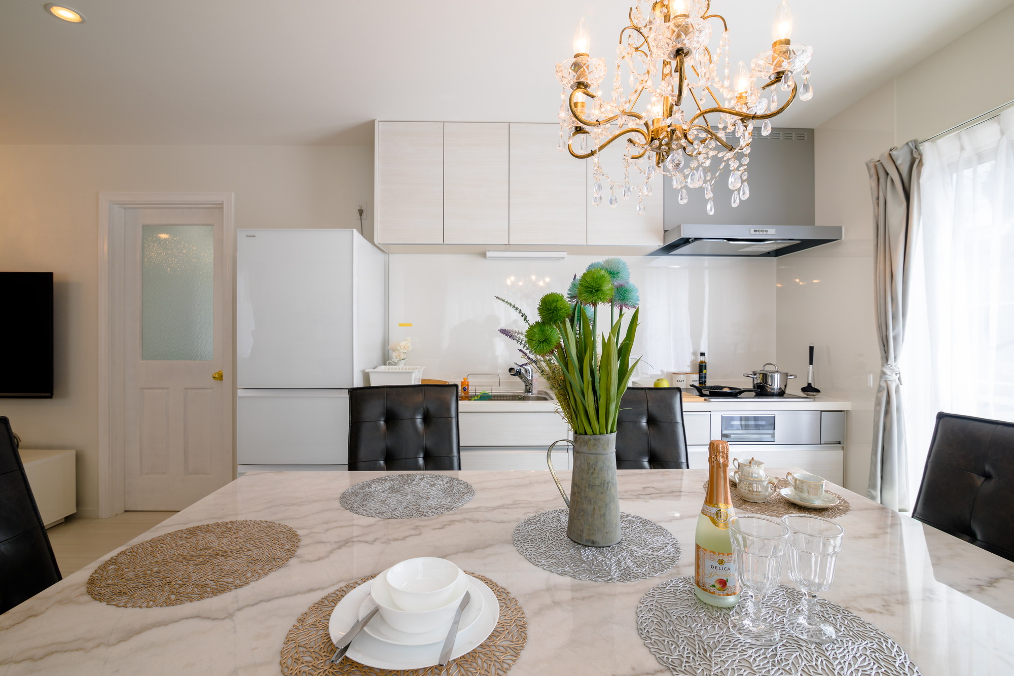 大理石のダイニングテーブルが大人気。お料理に必要なフライパン、鍋、各食器類、ケトル、電子レンジ、氷が自動で作れる冷蔵庫もそろっております。