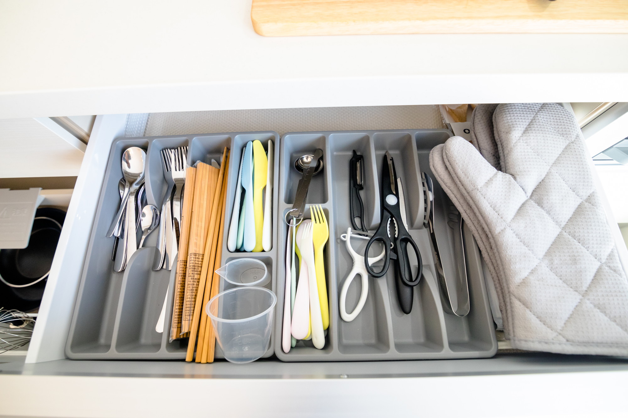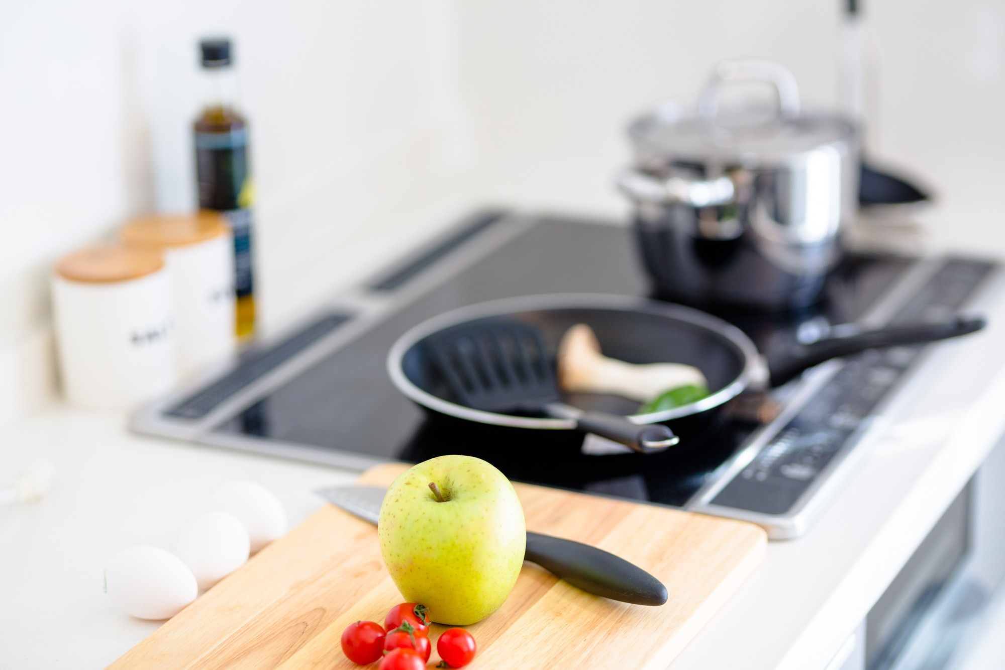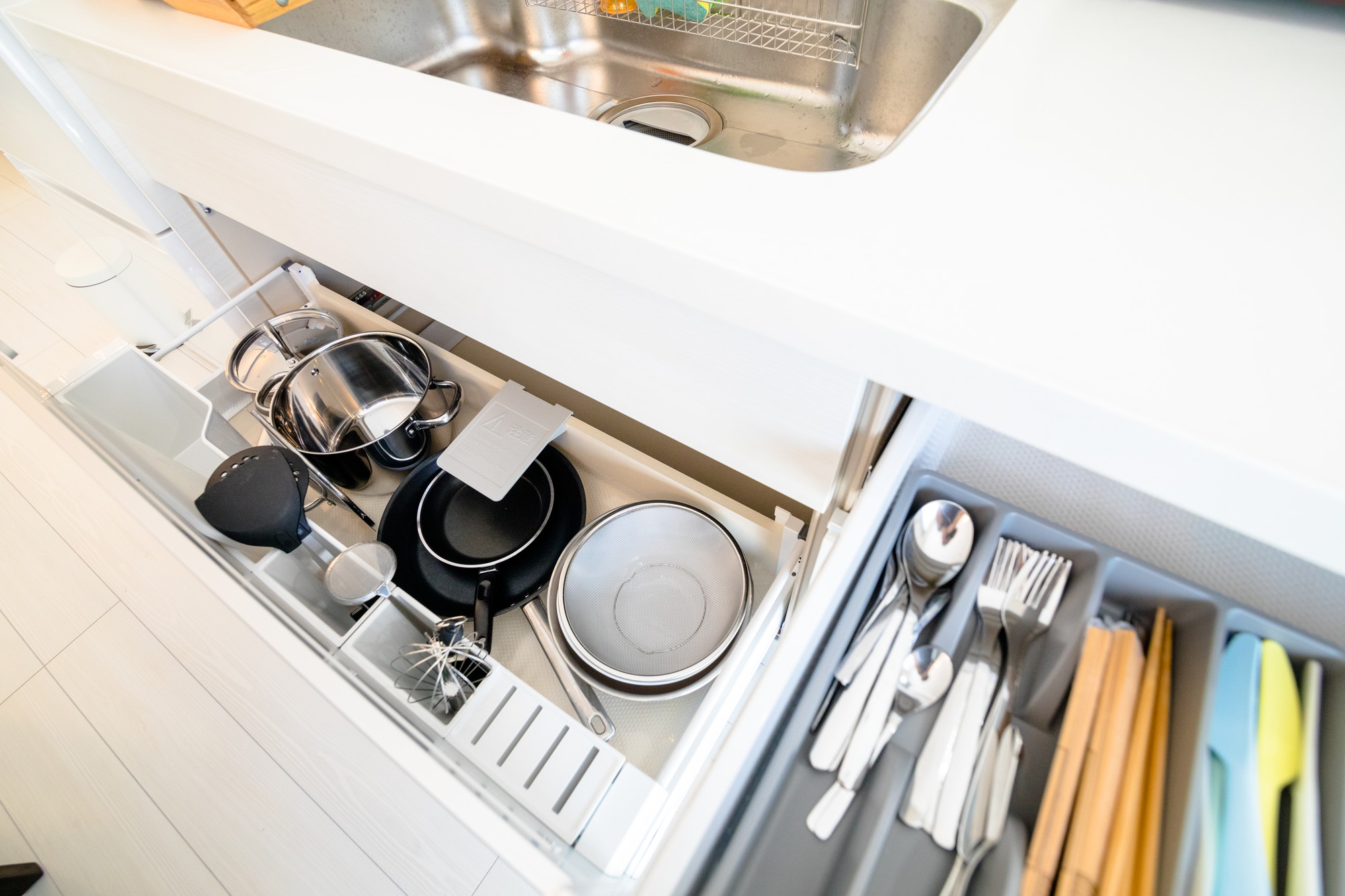 大理石のダイニングテーブルが大人気。お料理に必要なフライパン、鍋、各食器類、ケトル、電子レンジ、氷が自動で作れる冷蔵庫もそろっております。